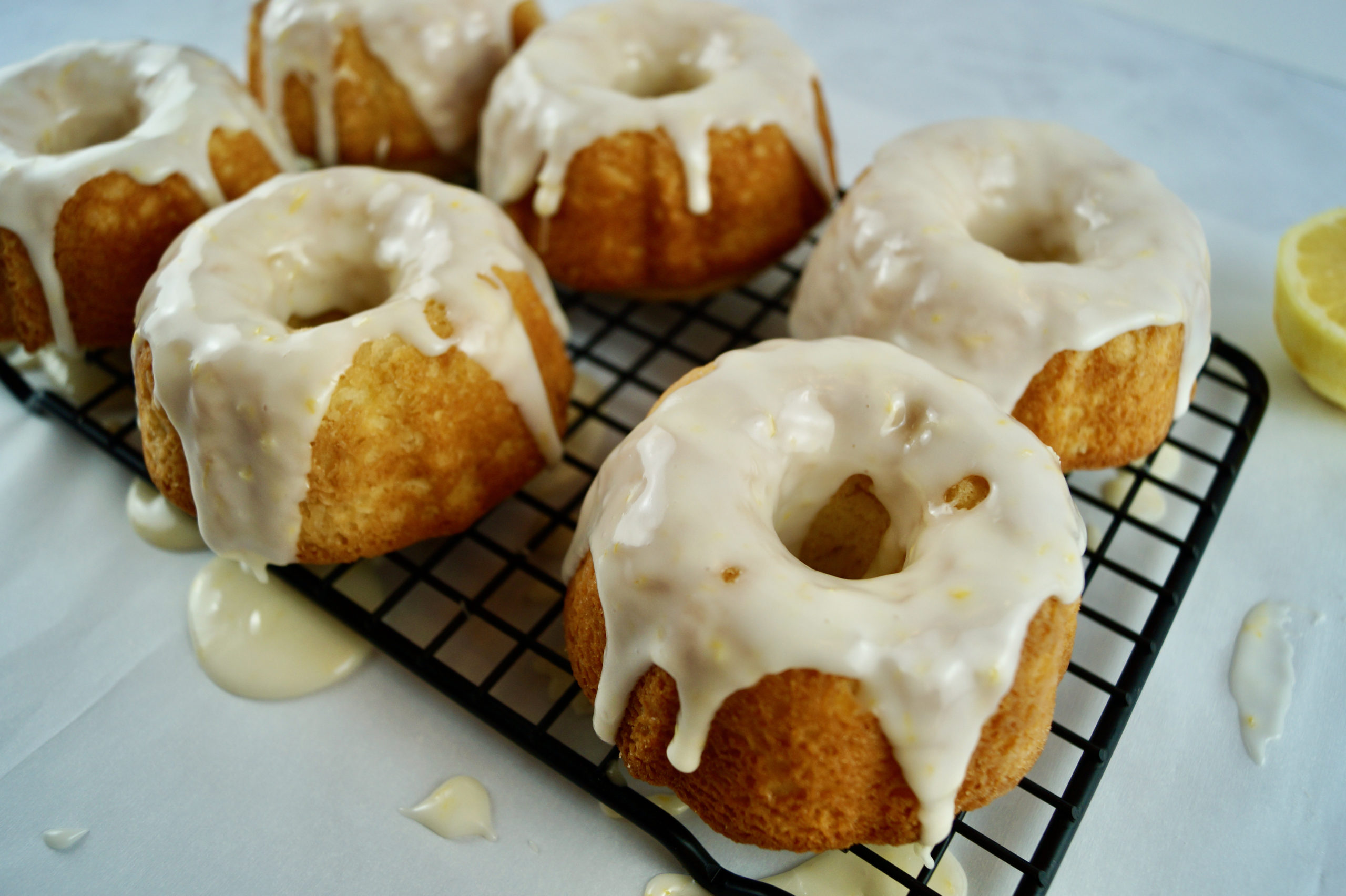 In a medium bowl whisk the powdered sugar, lemon zest, vanilla extract and salt together. Then begin adding the fresh lemon juice 2 tablespoons at a time at first and continue to add juice until you reach the consistency you want. You want a drizzle consistency, the glaze should ribbon which means when you drizzle it onto itself it should hold shape for just a second then dissolve back into the glaze. Spoon and spread a generous amount of glaze onto each cake.
